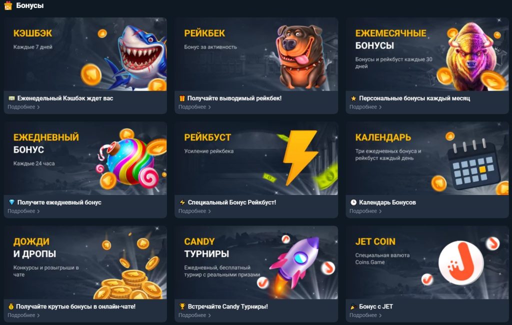 Coins Game казино предлагает широкий спектр бонусов, среди которых: